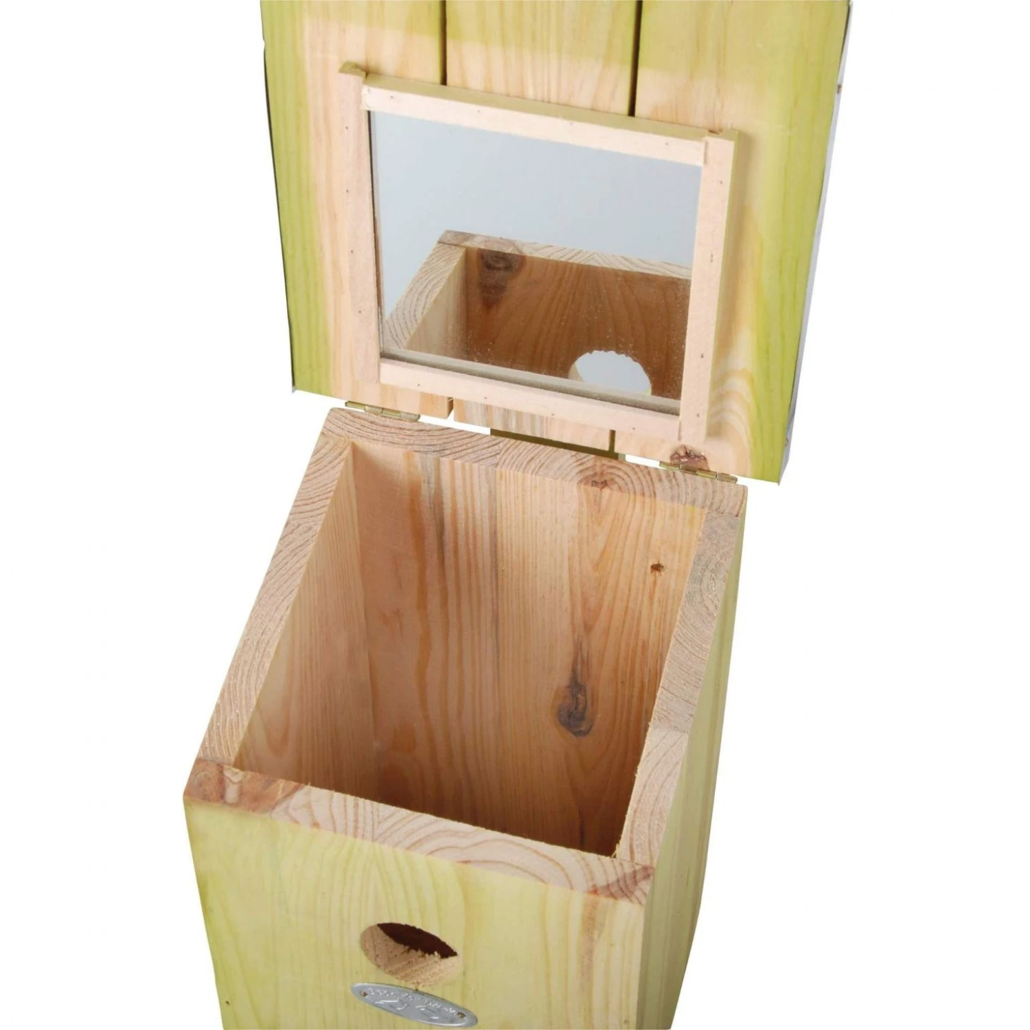 Hoe heerlijk is het om in voorjaar of najaar het rustgevende getjilp van vogels te horen. Maar hoe krijg je de vogels in je tuin? Het is gemakkelijkere dan je denkt. Een vogelhuisje plaatsen is soms al genoeg. Middels de spiegel in het open te klappen dakje kunt u eenvoudig een kijkje nemen naar het nest. In deze fraaie nestkast zullen in het bijzonder de koolmees, pimpelmees, mus en bonte vliegenvanger zich thuis voelen.