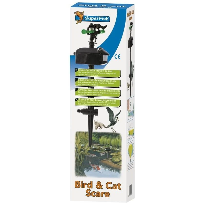 De meest doeltreffende en diervriendelijke manier om uw vissen te beschermen tegen reigers en katten en visdieven. U sluit de Bird & Cat Scare aan op de waterslang, zodra de sensor een indringer waarneemt jaagt hij deze weg met een krachtige waterstraal! U kunt het bereik en de gevoeligheid instellen waardoor de Bird & Cat Scare geschikt is voor grote en kleine vijvers.