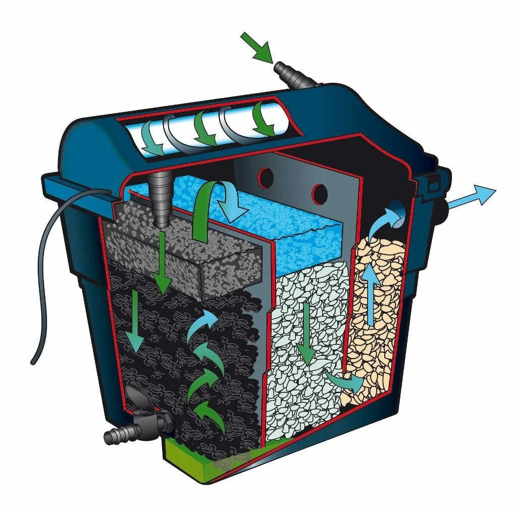 De Filtraclear 4500 plus set is een filtersysteem met 2 kamers. De kamers zorgen voor een biologisch-mechanische reiniging. Het filtersysteem met 2 kamers zorgt voor een grondige reiniging. Een groot voordeel van dit filter is dat deze zeer handzaam zijn, hierdoor ook gemakkelijk schoon te maken. De Filtraclear 4500 is geschikt voor een vijver van 1500 tot 4500 liter zonder vissen, met vissen 750 tot 2250 liter. De Filtraclear 4500 word geleverd incl. vijverpomp, UVC-apparaat en filtermedia.Â